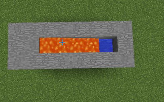 3、然后在水的上方倒入一同岩浆,岩浆遇到水会变成石头。岩浆不要碰到水的初始位置;