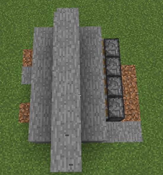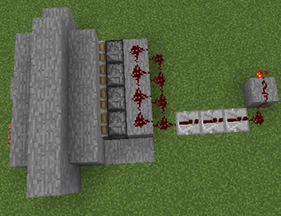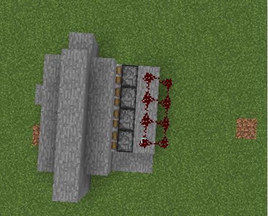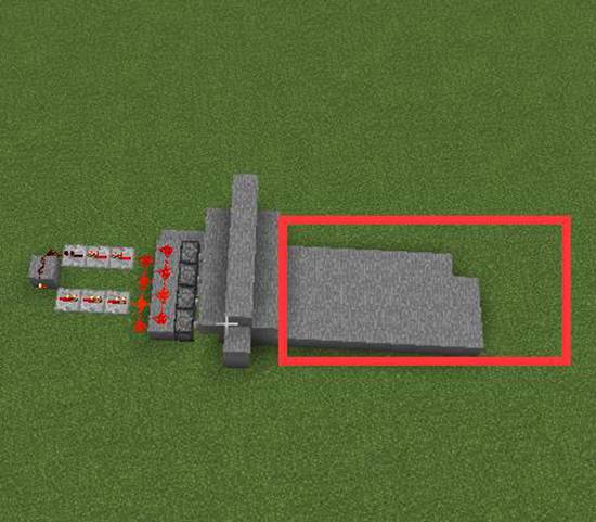 5、活塞的后方放一排石头,上面铺上红石,地下也铺一下红石;