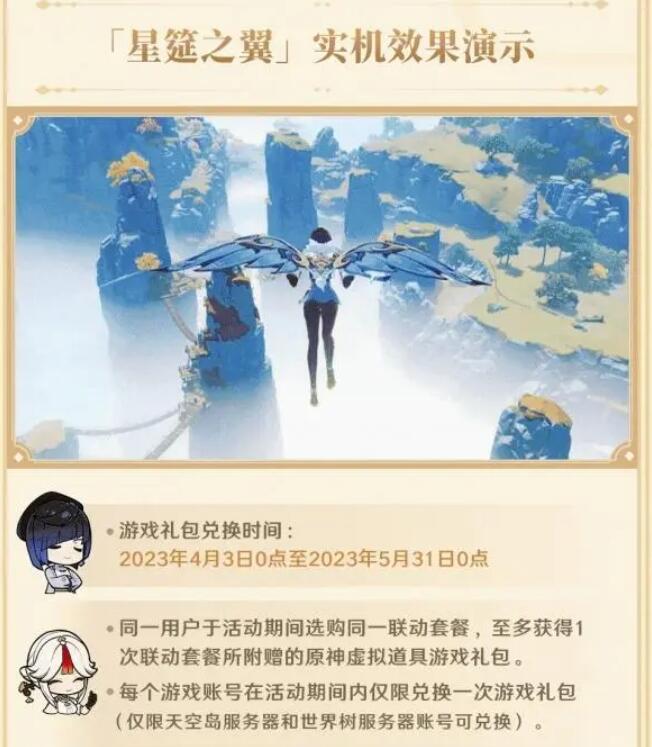获取方式:活动期间内购任意款必胜客x原神联动主题套餐得「寻珍之旅」限定游戏礼包,礼包内含联动限定风之翼【星筵之翼】