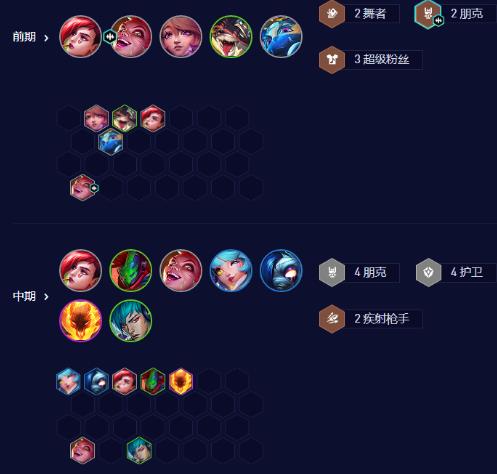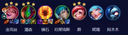 每回合都用朋克的1回合D牌D一次,然后存钱,打完石头人后大D一波金克丝三星,金克丝三星后,上人口,在6级追三星潘森,潘森3星后,上人口开高护卫和疾射枪手