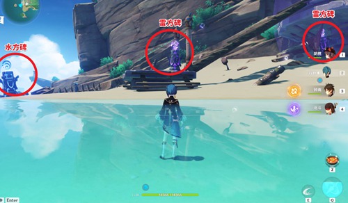 1、点亮丘丘人营地的三座雷元素方碑。两个雷元素方碑,一个水元素方碑,位置如下图所示,使用对应元素攻击解锁即可。