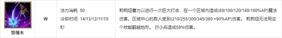 Q技能类似旧版的诺克萨斯之手Q技能,外圈命中会造成真实伤害。基础伤害很低,但由于冷却时间短,可以多次使用。另外Q技能可以叠加多层被动,来大幅提升移速,所以尽管没有位移,莉莉娅也能非常灵活,对于拉扯输出非常有帮助。