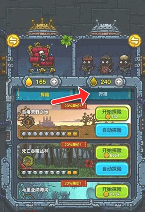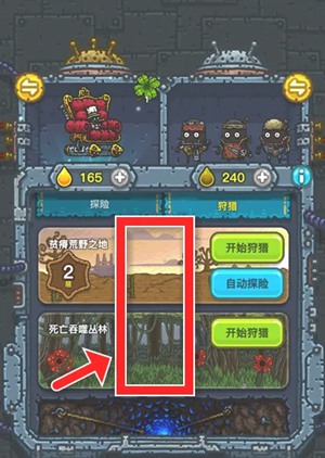 2、进入冒险界面,点击切换到【狩猎】选项。