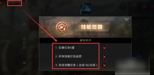 4.进入技能升品页面,点击觉醒技图标——即可获得该巨兽技能觉醒的解锁条件,最后根据提示,执行操作,即可觉醒技能。