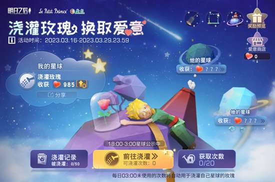 每个人心中都有朵独一无二的玫瑰。3月16日至3月29日期间,每位幸存者庄园门口将出现沉睡玫瑰星球,浇灌自己或他人星球上的玫瑰能获得星球主人的爱意,可在爱意商店中兑换联动限定道具。每个人的爱意值都不一样,快来寻找最爱你的幸存者吧!