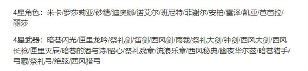 四星角色:米卡、罗莎莉亚、砂糖、迪奥娜、诺艾尔、班尼特、菲谢尔、雷泽、芭芭拉