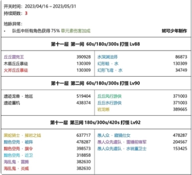 首先是深渊buff,11层:队伍中所有角色获得75%的草元素伤害加成,渊月:草种子造成的伤害命中角色时提高队伍200精通,两个很明显都是强推草体系,好在种门玩法多,大家随意上场吧