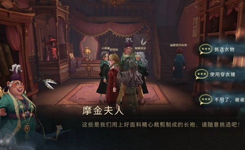 2、根据摩金夫人的指引点击“挑选衣物”或者“使用穿衣镜”,花钱购买想要的装备来换装就行了。