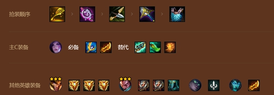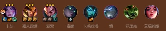 前期用4挑战2主宰过渡,中期优先开6挑战找两星亚索即可,亚索装备可以给让莎弥拉打工
