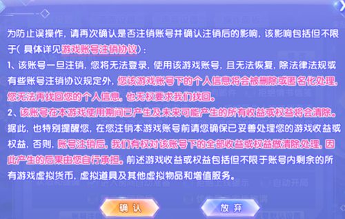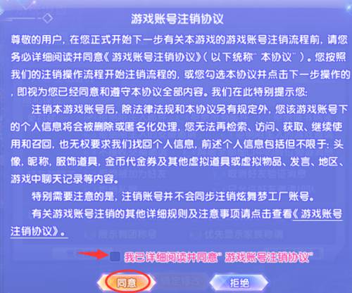 5、需勾选“我已仔细阅读并同意“游戏账号注销协议””并点击同意按钮后才可继续进行申请注销账号操作。