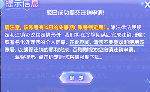 8、正式申请注销账号后会弹出提示弹窗,点击“确认”按钮后将立即下线。