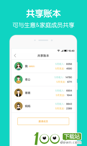 点击账本右上方“三”---“共享账本”---点击“邀请成员”