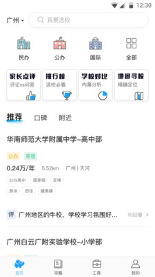 2、提供国内百余个城市,数十万所学校数据查询,贯穿幼小初高学段,涵盖公办、民办、国际学校