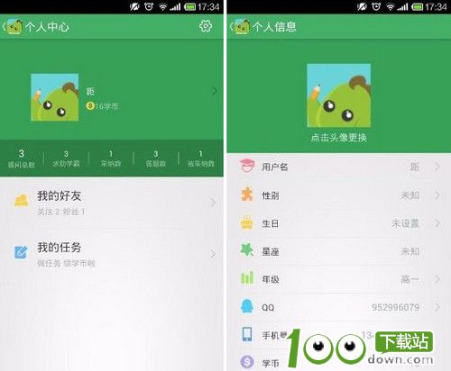 步骤四:关于个人信息的修改和查询 当你注册阿凡题之后,系统会自动帮你命名,比如学沫1564、学帝6742等,很多童鞋如果觉得系统自动生成的名字一点都不霸气侧漏的话,那可以自己进行修改哇!在登录的首页,点击右上角的头像便可以进入“个人中心”,“个人中心”里包含了“提问总数”、“求助学霸”、“采纳数”、“答题数”、“被采纳数”、“我的好友”、“我的任务”的内容。要想进一步修改个人信息时,那就点击大头像进入“个人信息”即可。