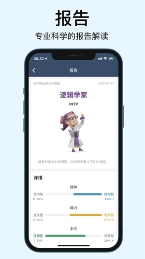 专业性格划分:软件将用户的性格划分为十六个类别,每个类别都有其独特的特点和倾向性,帮助用户深入了解自己的性格特点。